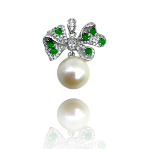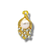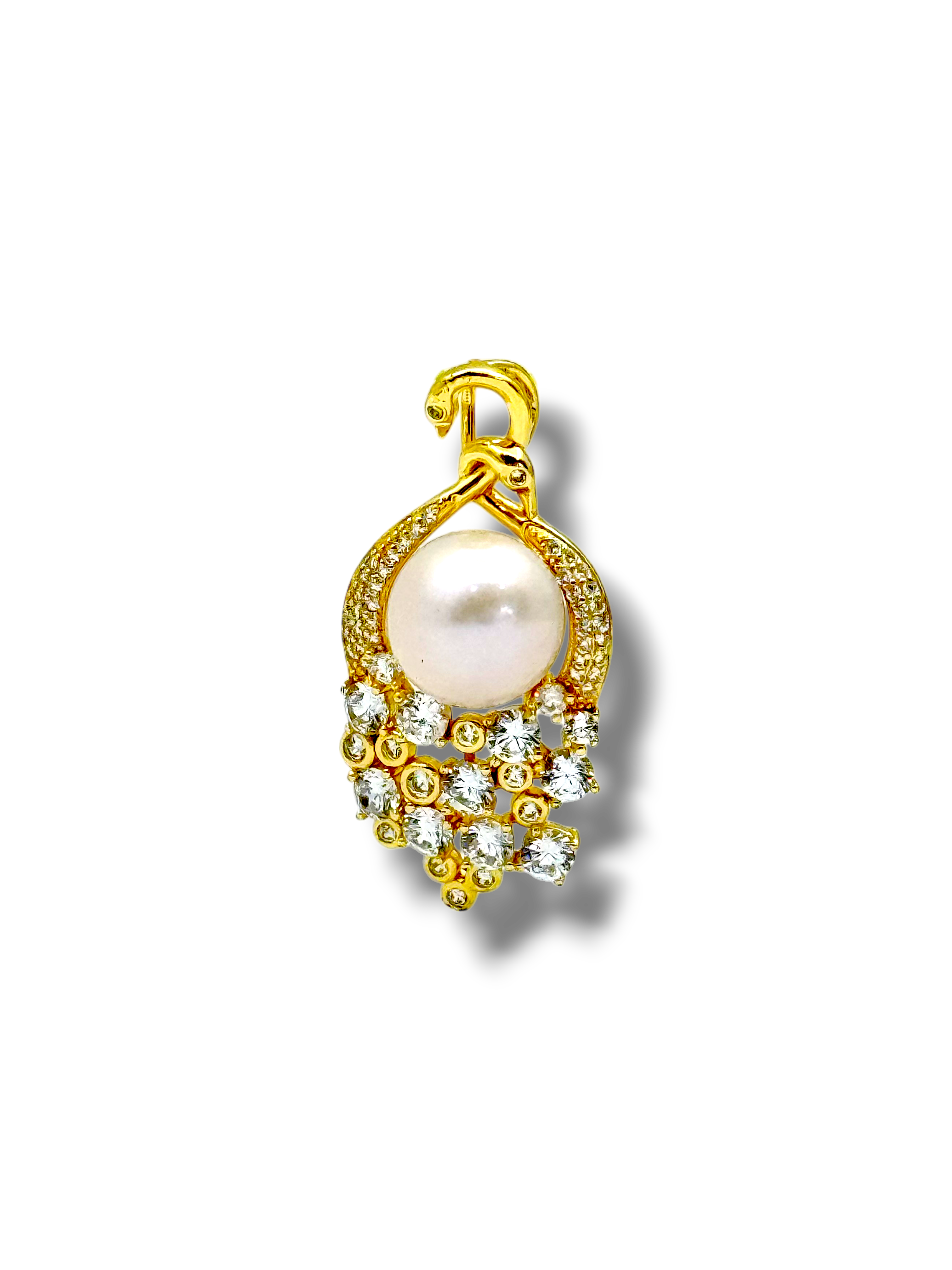 This dazzling pendant features a luminous white pearl set within a graceful golden arc, adorned with sparkling pavé zircon accents. A cascading cluster of brilliant stones adds a luxurious waterfall effect, making it a statement piece full of elegance, movement, and shine.